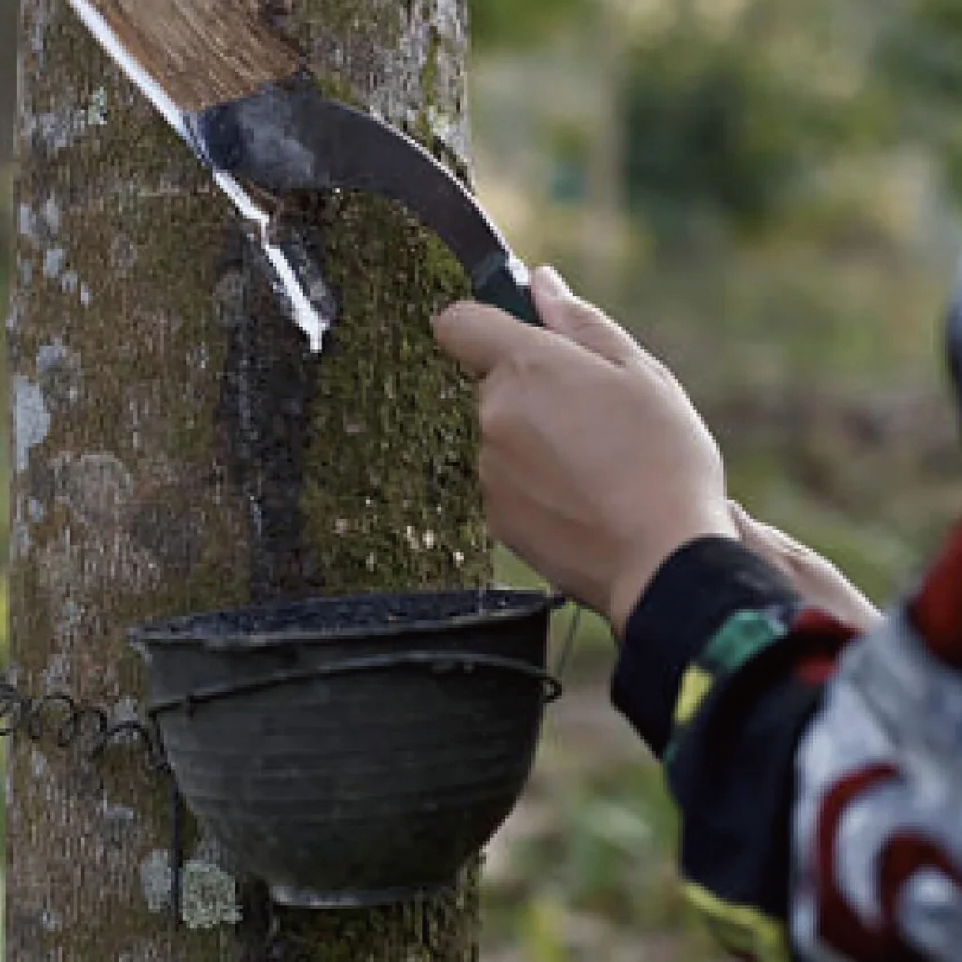 天然ゴムの原料として有名なラバーウッドは、ゴムの原料となる樹液を約20年間採取した後に伐採され、家具などの素材に再利用されます。樹液から木材まで無駄なく活用できるとてもエコな素材として知られています。
