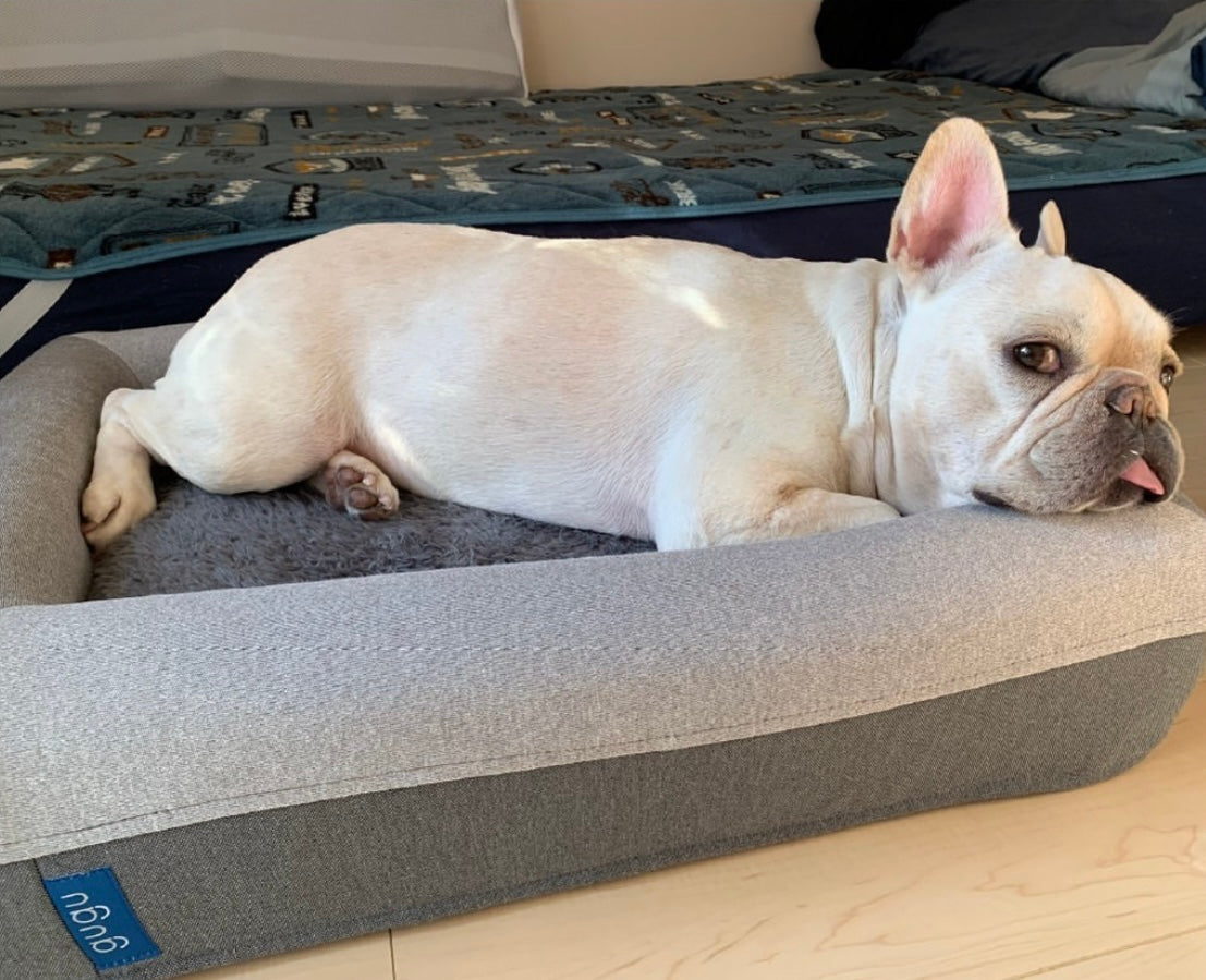 “届いてから毎日愛用しています!今まで何十個とベッドを噛んで壊してきましたが、guguドギーは気づいたらゴロンと寝ています笑”