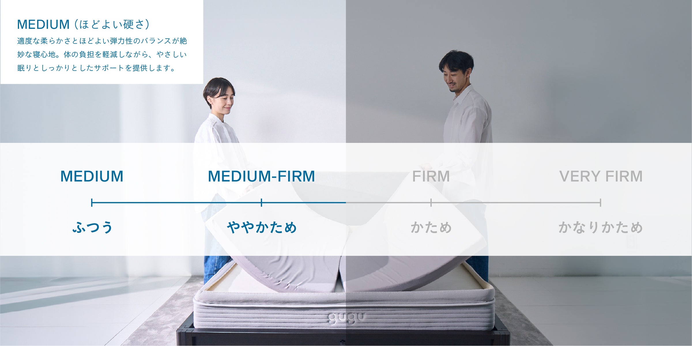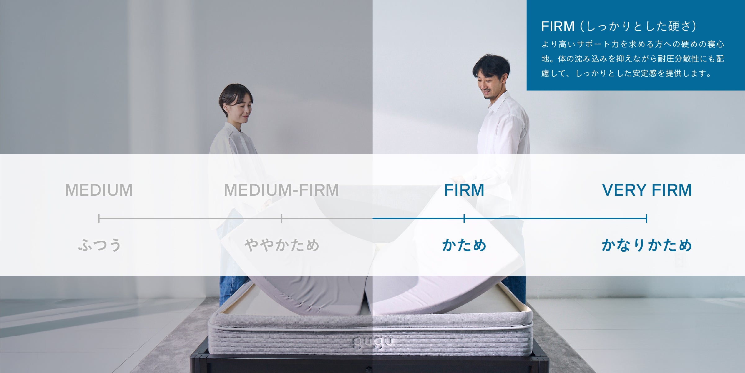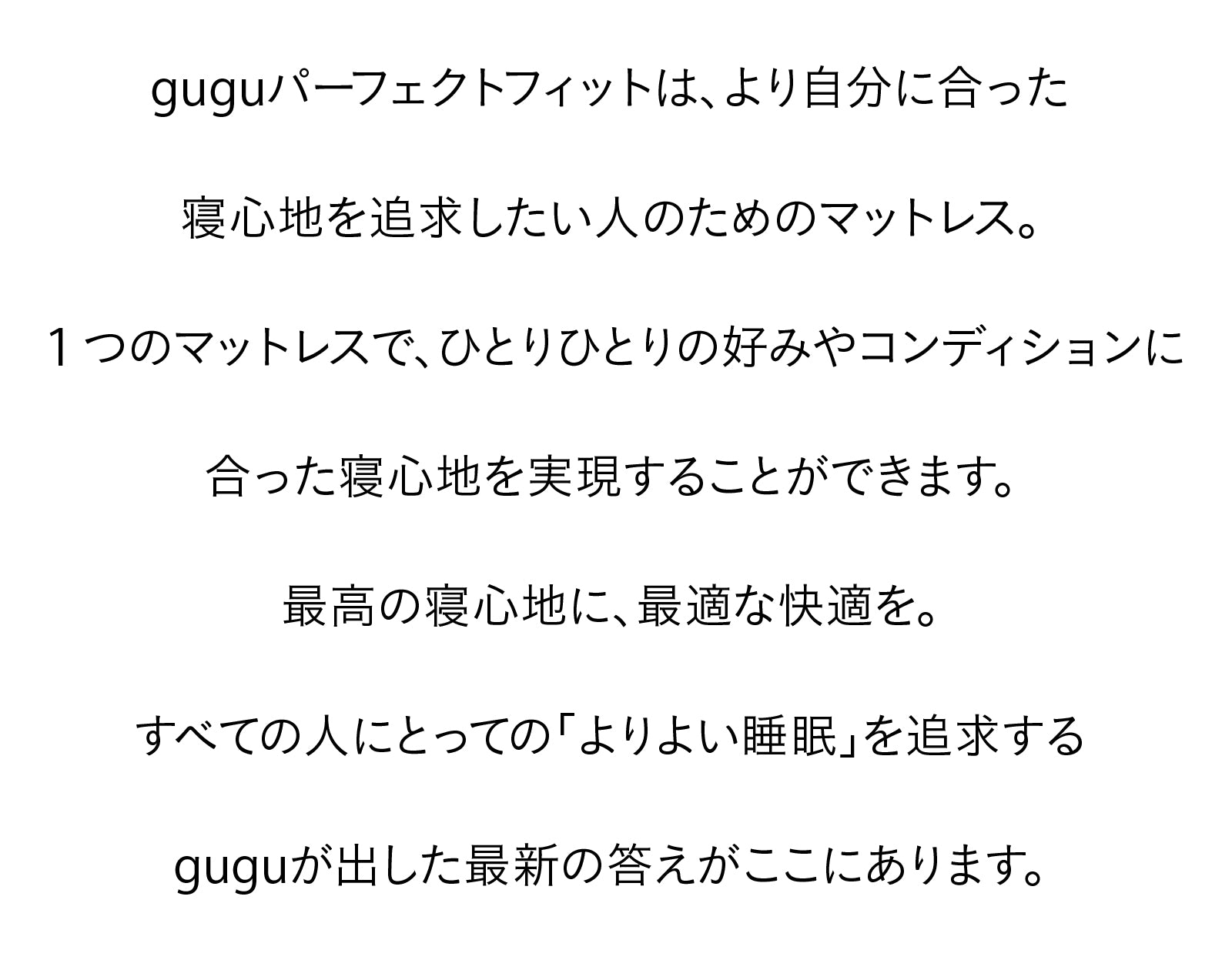 自分に合う硬さを、自分で選ぶ。 gugu パーフェクトフィットは、好みに合わせて硬さを選べるマットレス。一人ひとりの眠りに最適なサポートと快適さを提供します。調整可能なフィット感で、guguが届ける最新の答えです。