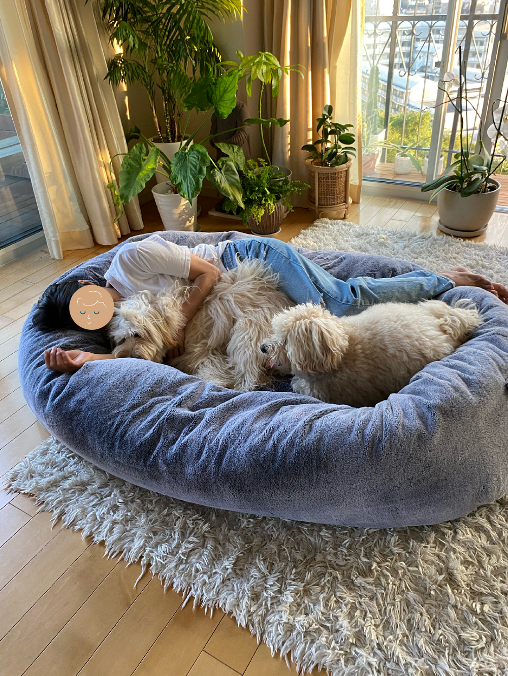 飼い主と愛犬が共にくつろいで過ごせる大型サイズの犬用ベッド。guguハギーで、大切な家族と一緒にくつろぐ、かけがえのない幸せなひとときを。